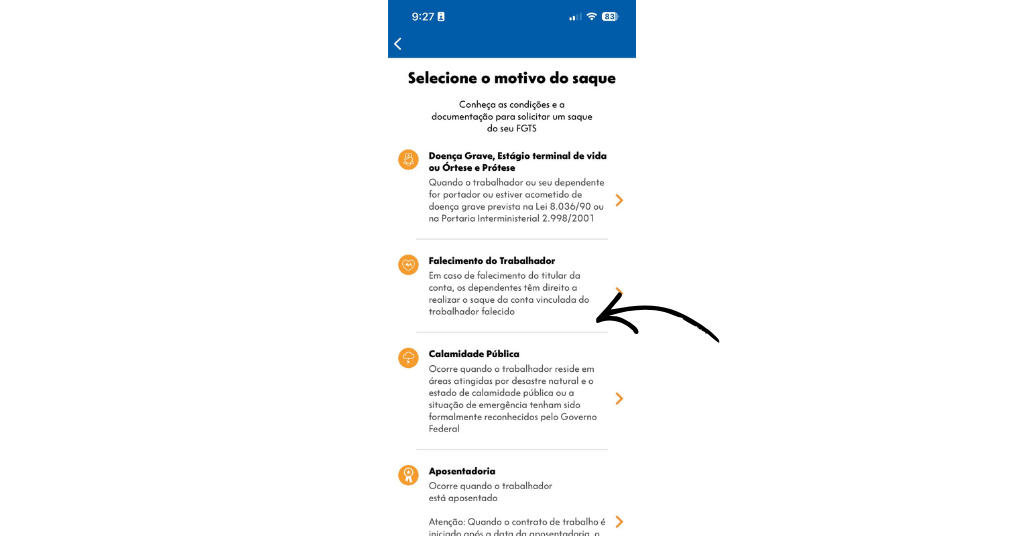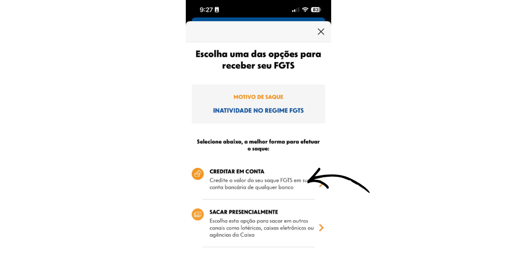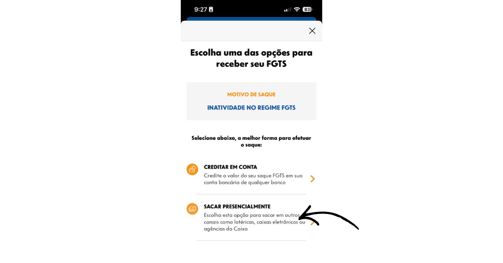 2. Veja se há opção de saque e escolha o motivo pelo qual deseja sacar e clique em sacar presencialmente.